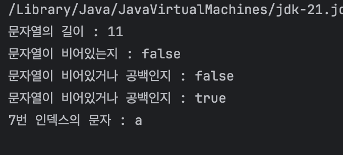 System.out.println("문자열이 비어있는지 : " + str.isEmpty());
